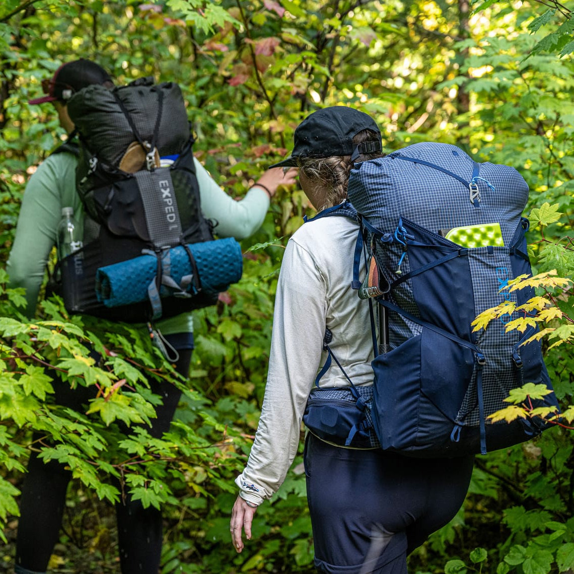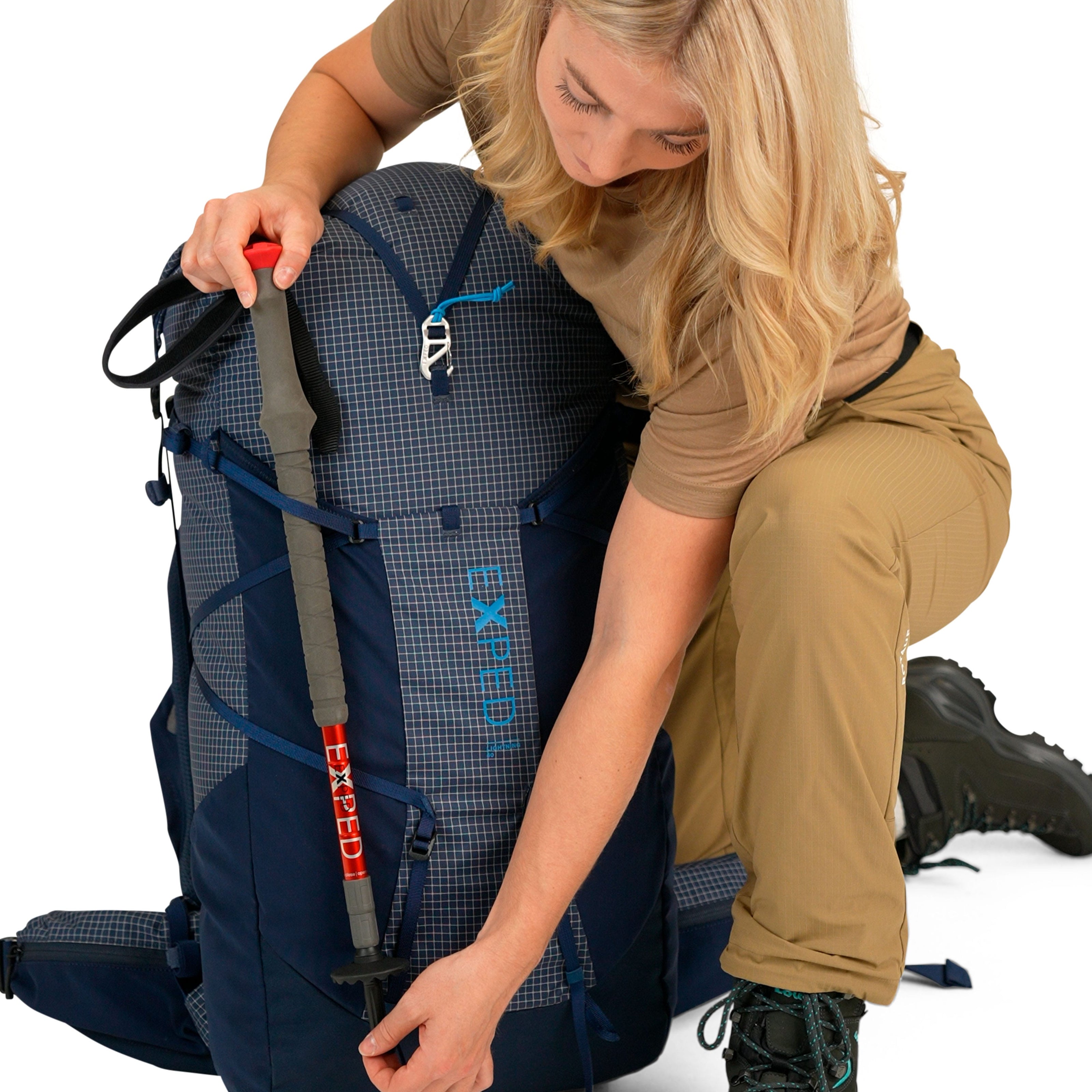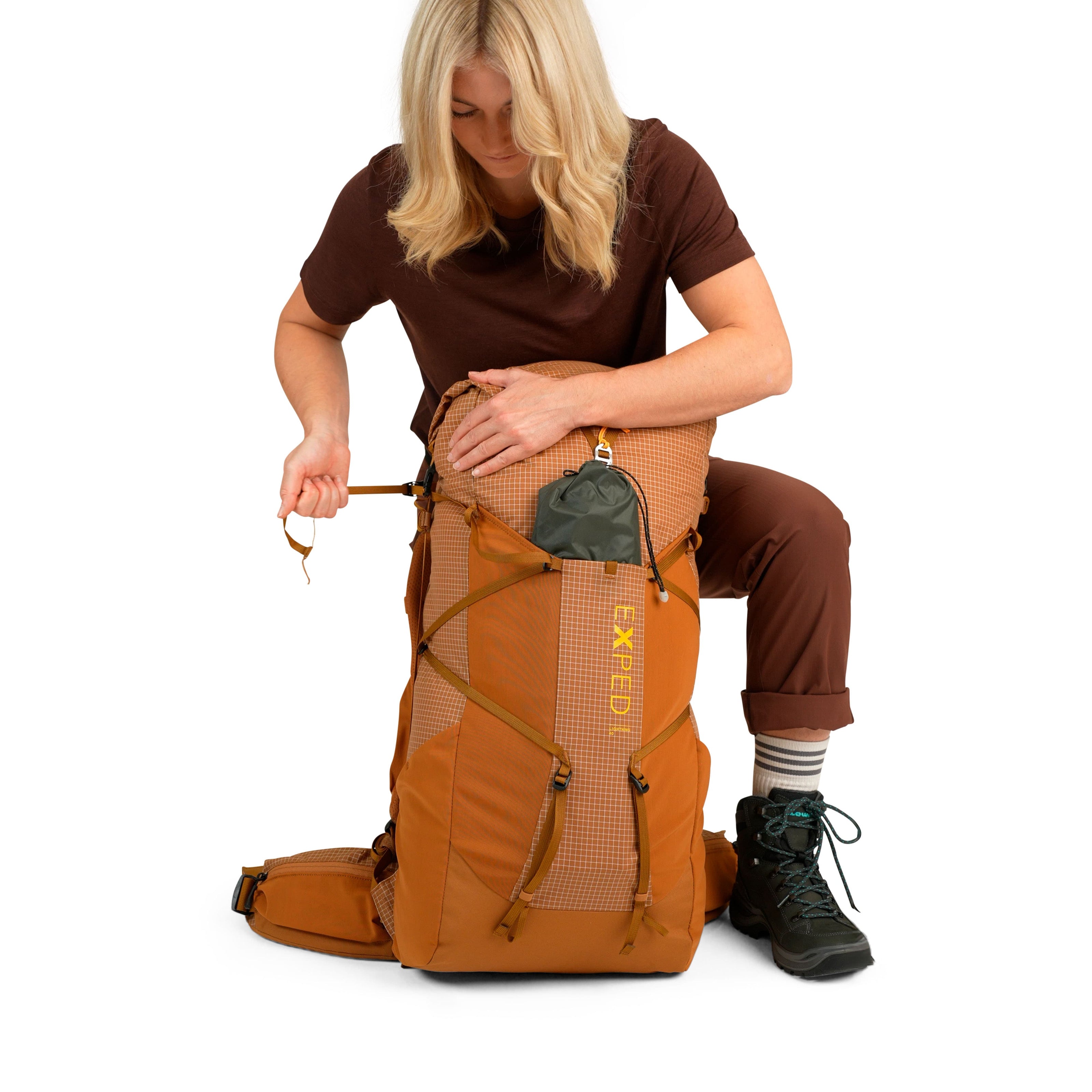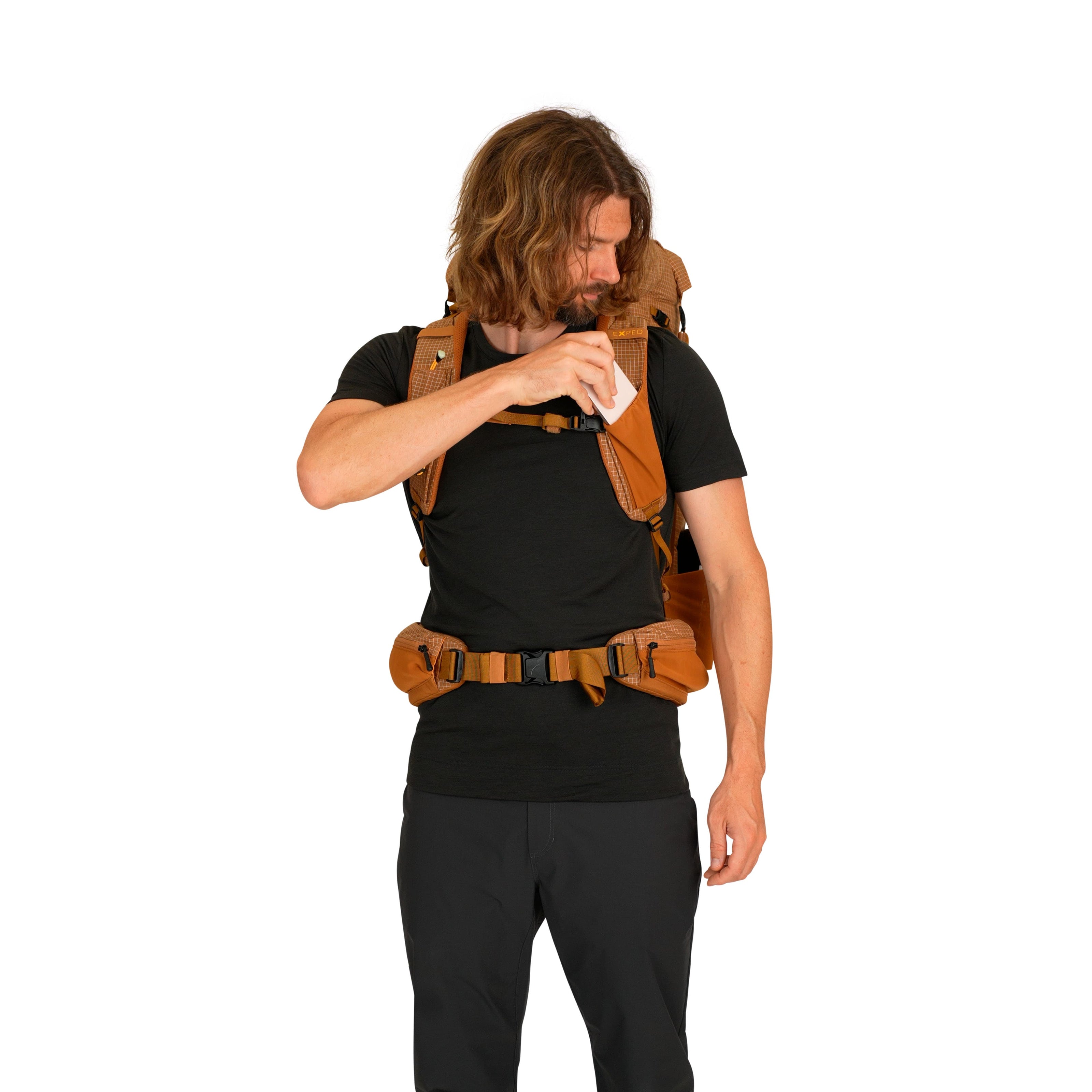 Sophisticated pack volume management allows flexible adjustments. The zig-zag compression straps are easy to adjust and, together with the roll-top fastener, allow variable volume control. They also secure larger equipment such as a sleeping mat or flysheet. Generous mesh outer pockets, zipped pockets on the hip belt and modular attachment points support clear organisation.